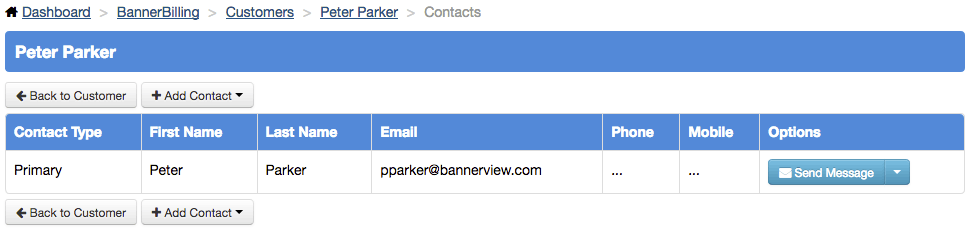 You can create a new message to a contact by clicking 'Send Message' on the manage contacts screen, or from the customer overview by clicking the down arrow next to 'Modify' and selecting 'Send Message'.