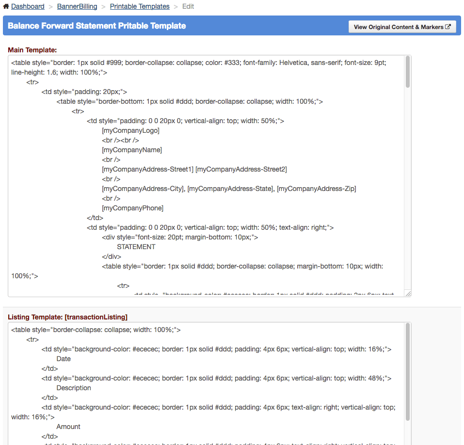 Clicking the pencil icon in the options field will take you to the template editor screen, where you can click into the different content boxes to update the markup. In the event that something happens, and the layout of your template become corrupted, you can restore to the original content by clicking the 'View Original Content and Markers' button with your middle mouse button to open in a new tab, and then copying and pasting the contents in place of the non-working html.